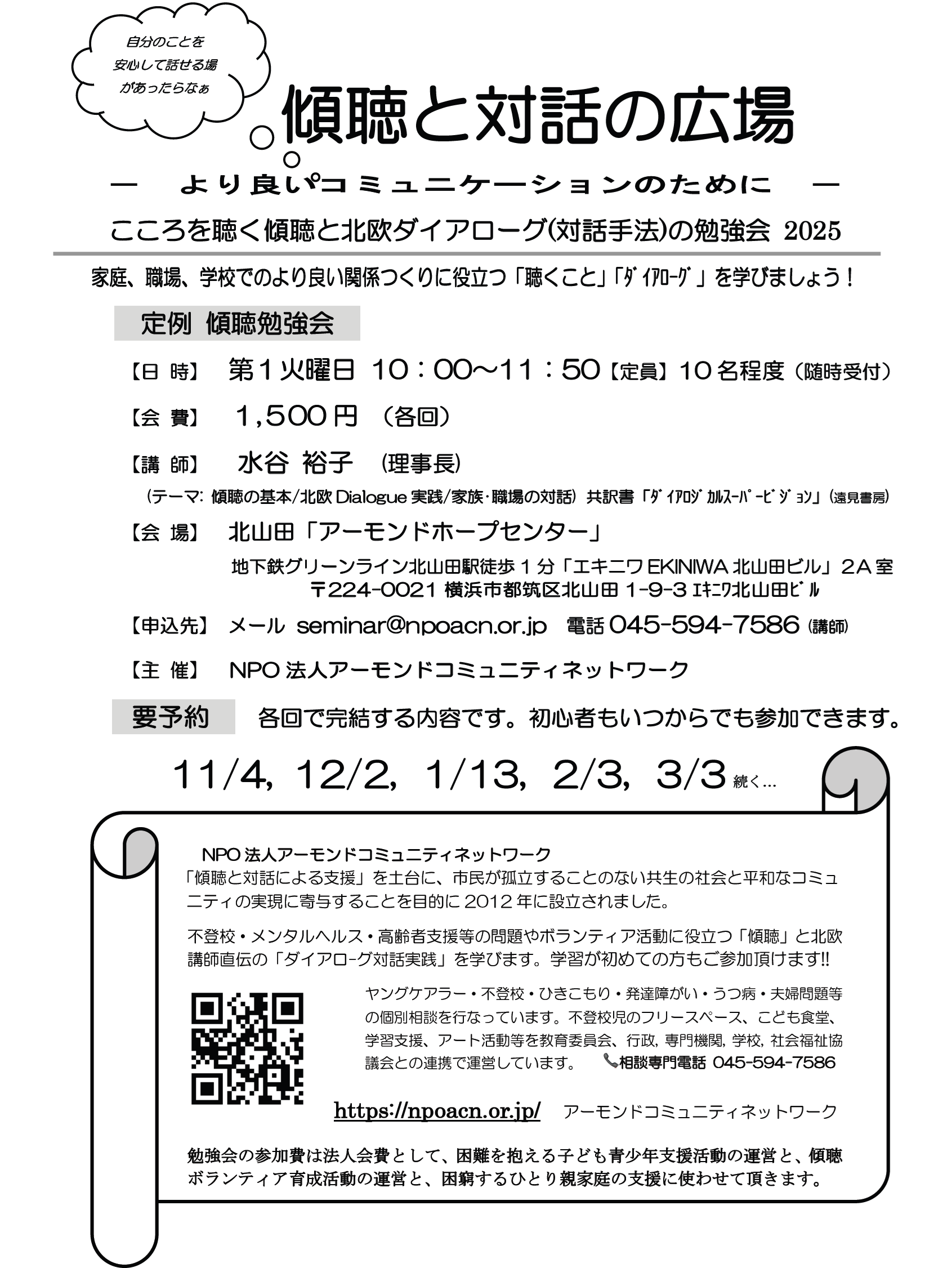 傾聴研修・ダイアローグ研修会 投稿日: 2025年11月7日2025年11月27日 投稿者: acn 横浜市営地下鉄グリーンライン北山田駅より徒歩1分のアーモンドホープセンター(エキニワ北山田 2A)で開催しています。 事前予約制。定員で締め切りますのでご了承ください。 子ども青少年・不登校・ひきこもり・高齢者・子育て等の支援や、福祉職、ボランティア活動に役立つ「傾聴支援」と「ダイアログ支援」を共に学びます。傾聴学習が全く初めての方も、参加できます!! 「傾聴と対話の広場」お申し込みフォーム