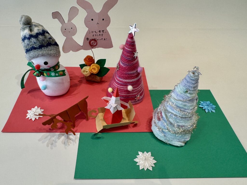 テーブル飾り。雪だるまにツリー、雪の降る中、トナカイがひくソリに乗ったサンタクロース。「もうすぐクリスマス!」という、わくわくしたあたたかい気持ちが広がります