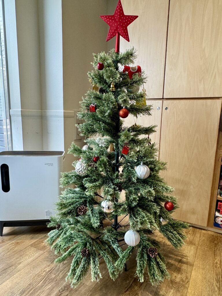 会場に飾られたクリスマスツリー。こどもたちと一緒に飾りつけをしました。今年は赤色のオーナメントがテーマです